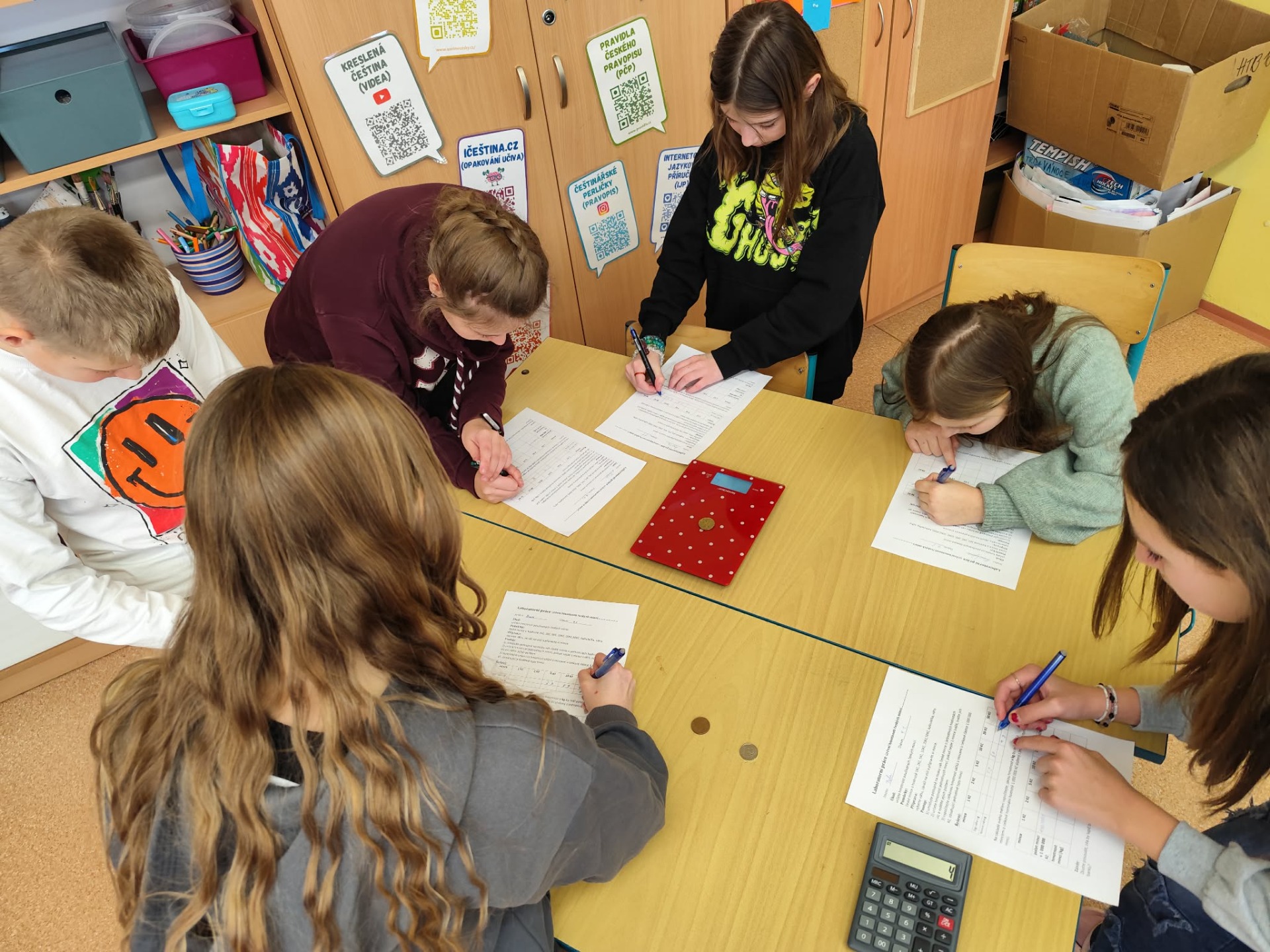 V hodinách fyziky jsme se začali věnovat hmotnosti. Při naší první laboratorní práci jsme měli možnost vážit na rovnoramenné váze nebo digitalní. Naším úkolem bylo zvážit jednotlivou hmotnost kovových mincí Kč. Také jsme měli spočítat, kolik by vážil milion korun uvedených mincí.