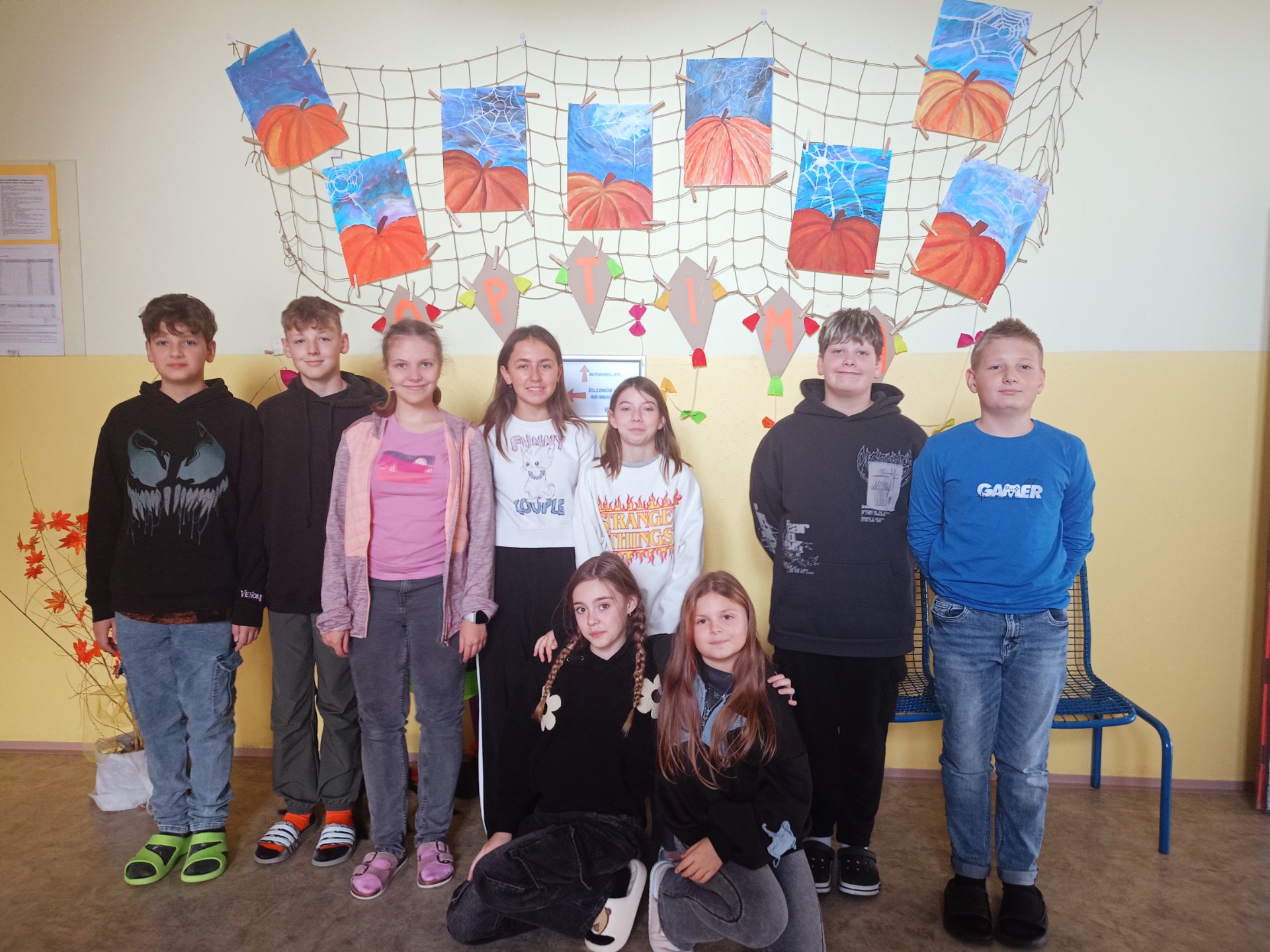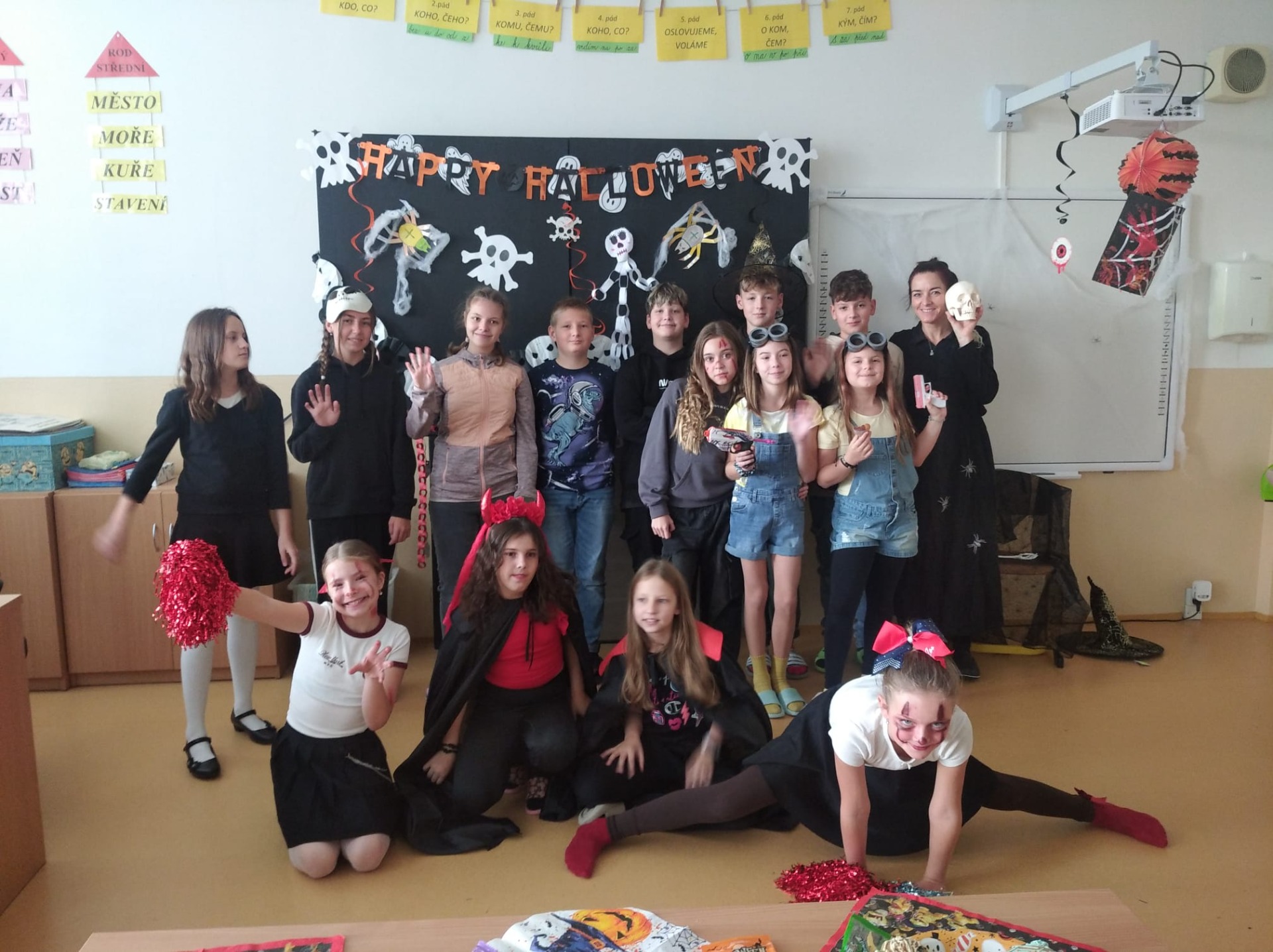 24. 10. Halloween ve škole - Halloween v naší škole se slaví hlavně na 1.stupni, ale nám se po této akci stýskalo, tak jsme navštívili paní učitelku Moniku Královou (naši bývalou třídní učitelku) a vyfotili jsme se u ní ve třídě a popovídali jsme si o minulém školním roce a Halloweenu u ní ve třídě. Na druhém stupni už náš čekají jiné akce a projekty " pro velké ", ale zavzpomínat je fajn.