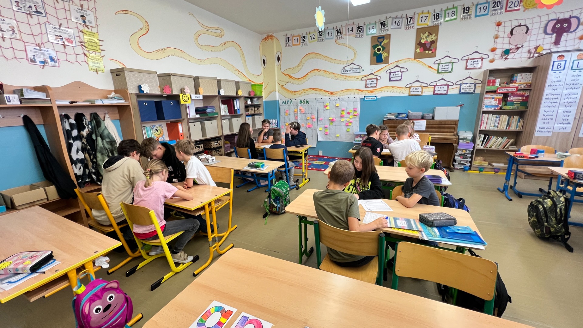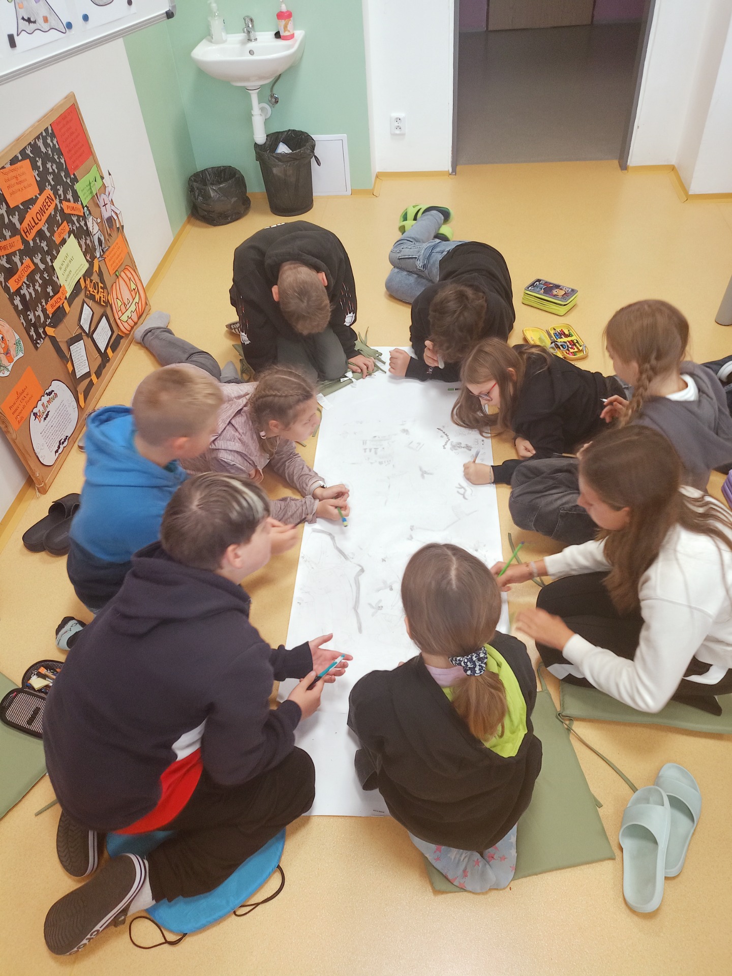 Třídnická hodina - Ostrov - žáci měli za úkol bez mluvení nakreslit společný ostrov, na kterém budou bydlet a každý z nich bude mít na ostrově své místo. Třídnickou hodinu jsme si moc užili. Někteří komunikovali pomocí rukou a nohou neustále a někteří si v poklidu kreslili. Máme moc krásný obrázek na památku.