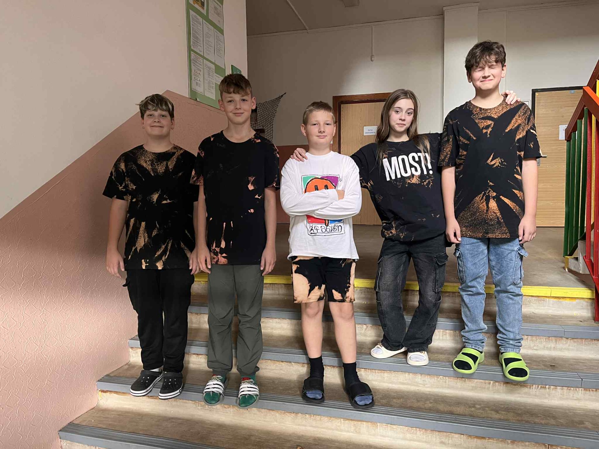 "Během hodiny domácích prací si děti vyzkoušely techniku batikování. Na fotkách můžete vidět, jak se jim práce vydařila. Některá trička dopadla tak povedeně, že je děti s radostí nosí i jako běžný oděv."